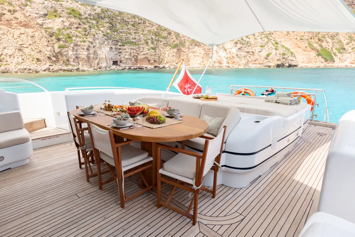 The main deck features spacious relaxation areas, with sundecks at both the bow and stern, as well as an alfresco dining area. The swim platform is ideal for swimming or engaging in water sports.
