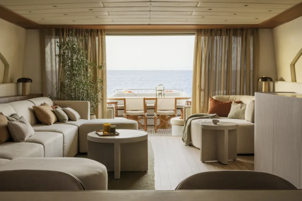 Inside, the Mangusta 108 is elegant and inviting, with a well-thought-out layout and high-end details. The main salon, surrounded by large windows, creates a bright and relaxing atmosphere—perfect for enjoying peaceful moments on board.
