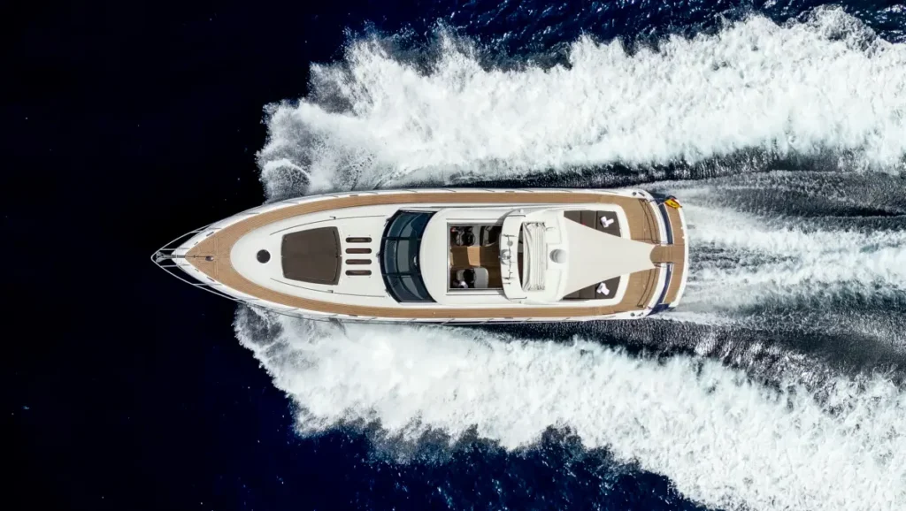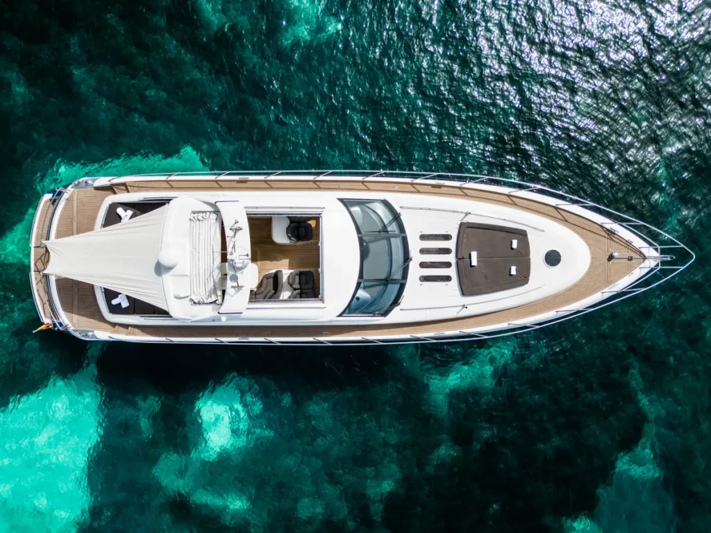 The exterior deck stands out for its spaciousness, featuring two sunbathing areas, an outdoor dining space, and a hydraulic swim platform, perfect for enjoying the sea. Inside, the Princess V65 offers three double cabins with en-suite bathrooms, a fully equipped kitchen, and a spacious lounge with panoramic windows. Its combination of elegant design and power makes it one of the most attractive options for those seeking an exclusive Mediterranean experience.