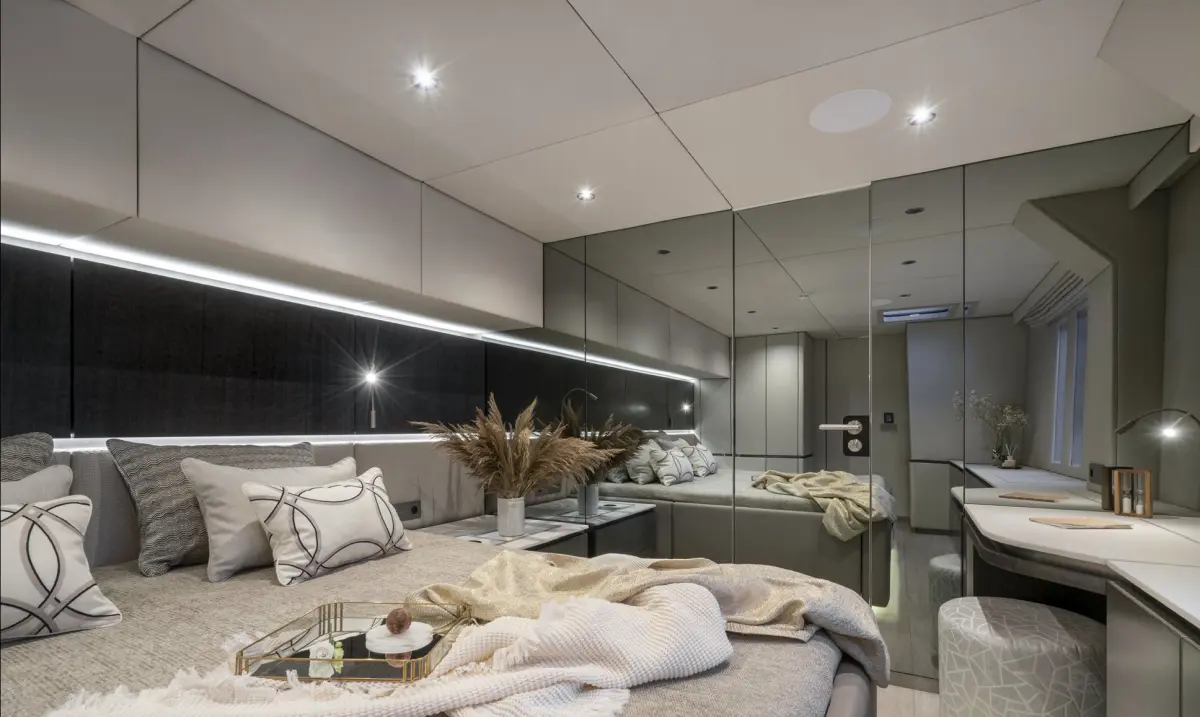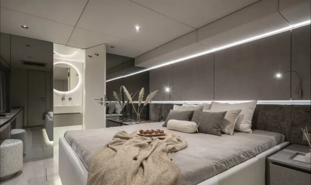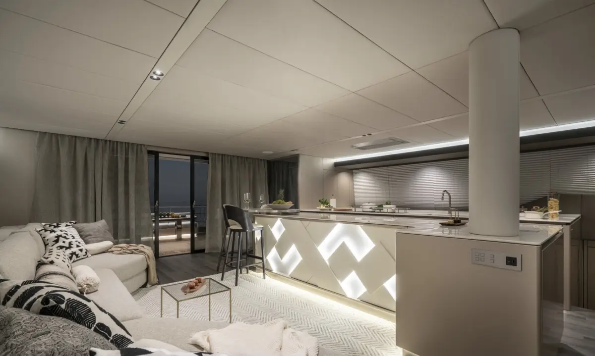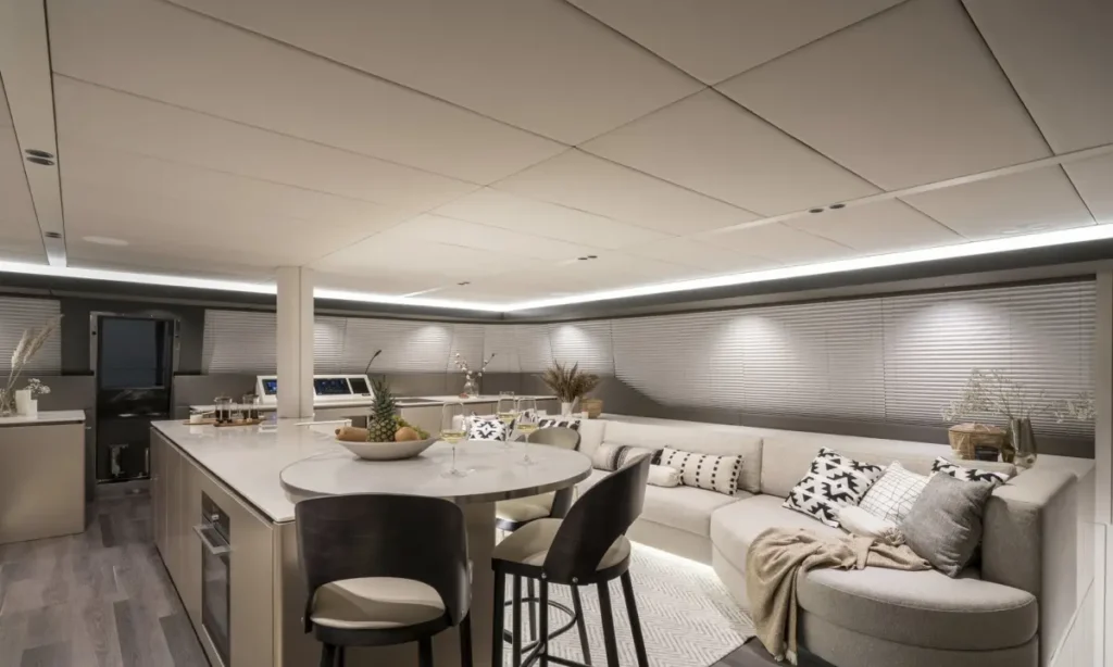 Die Sunreef 70 bietet ein großzügiges Deck mit mehreren Entspannungsbereichen, darunter eine Terrasse auf dem Oberdeck (Flybridge), zwei große Sonnenliegen und eine weitläufige Badeplattform für einen bequemen Zugang zum Wasser. Im Innenraum verfügt dieser Katamaran über vier en-suite Doppelkabinen, einen Panoramasalon und eine Gourmet-Küche. Ideal für mehrtägige Kreuzfahrten, garantiert die Sunreef 70 ein einzigartiges Erlebnis, das Luxus und Komfort in jedem Detail vereint.
