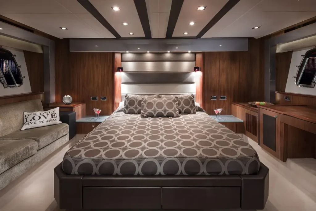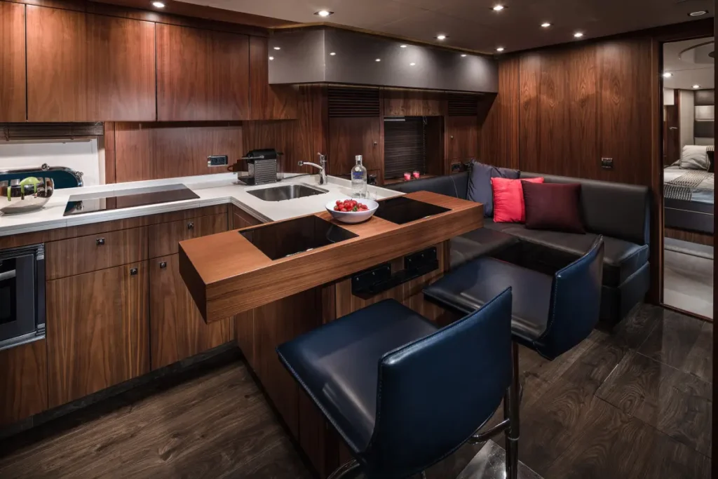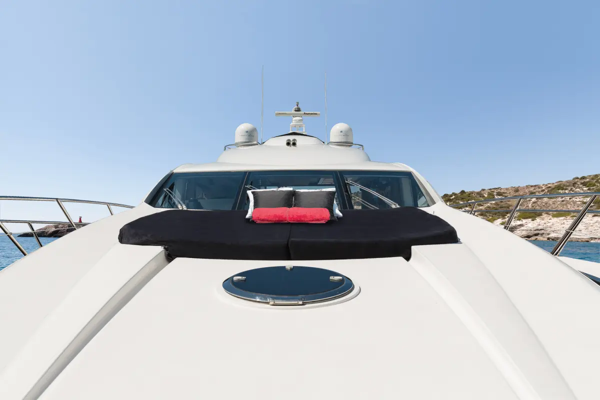 Das Hauptdeck bietet eine großzügige Entspannungszone mit Sonnendeck und bequemen Sitzgelegenheiten, während der Innenraum durch ein elegantes, modernes Design besticht. Der offen gestaltete Salon ist mit hochwertigen Materialien ausgestattet und bietet alle Annehmlichkeiten, um das Meer in vollem Komfort zu genießen.