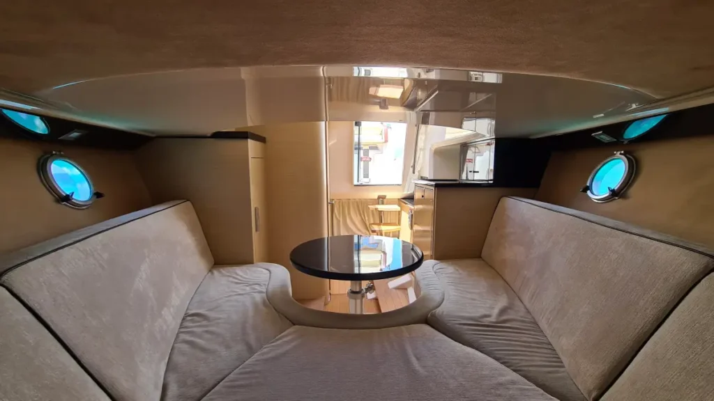 Destaca su cabina interior, equipada con una cama doble, baño y zona de estar, lo que permite descansar cómodamente o incluso pasar la noche a bordo. La cubierta cuenta con dos amplias zonas de solárium, una en proa y otra en popa, además de una cocina exterior y una ducha de agua dulce, proporcionando todo lo necesario para disfrutar de una jornada completa en el mar.